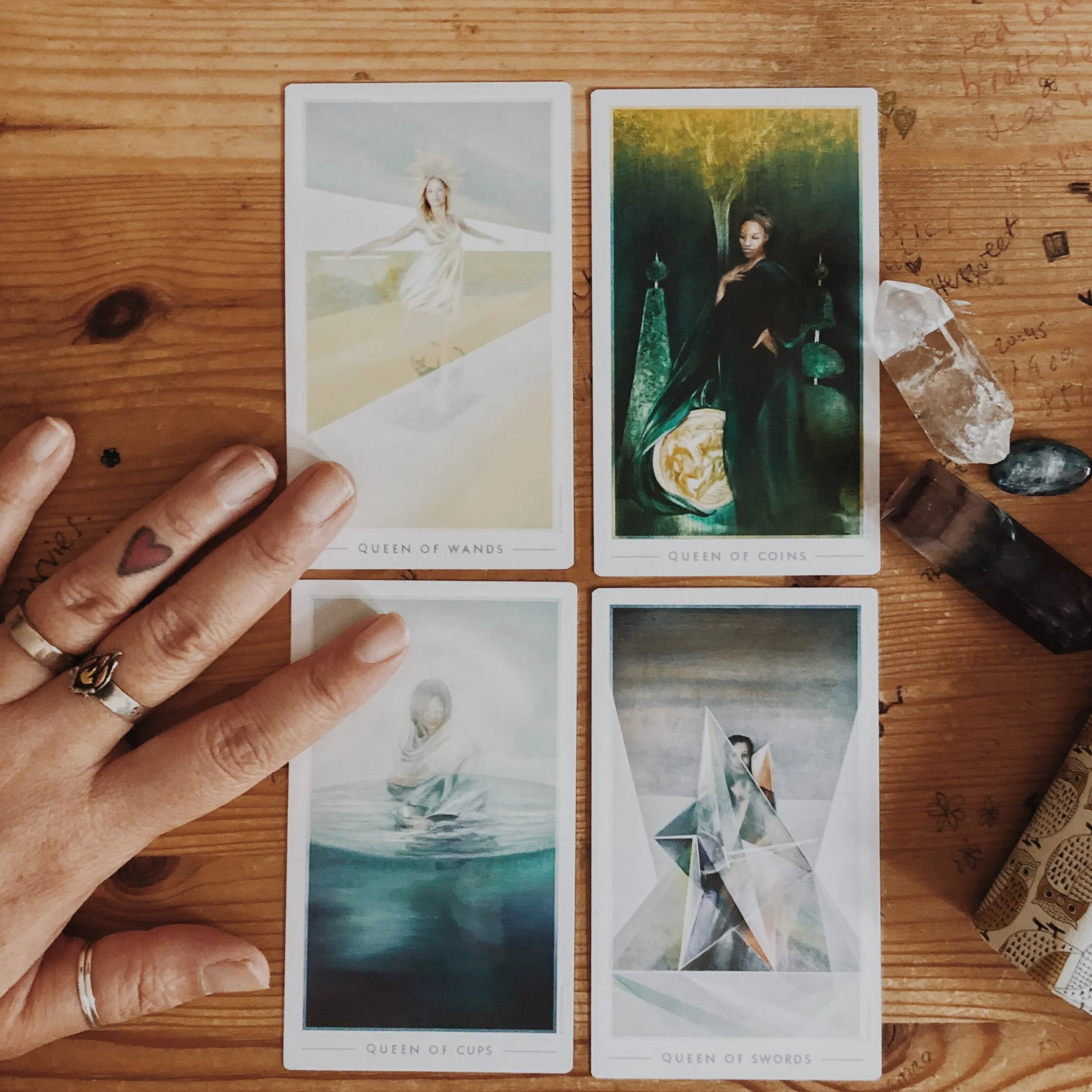 We connect to the magic and spirit of our intuition through the Queen of Wands, the heart and depth of our emotions with the Queen of Cups, the power and imagination of our mind through the Queen of Swords, and the embodiment of our soul in the Queen of Pentacles.